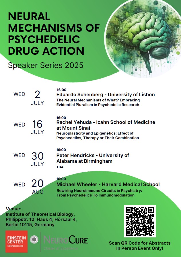The so-called psychedelic renaissance of the last decade has brought psychedelic substances back into the global research spotlight. Psychedelics are under intense investigation for their potential applications in the treatment of depression, anxiety, substance use disorders, obsessive compulsive disorder, eating disorders, and post-traumatic stress disorder. Until today, their mechanisms of action at the molecular, cellular, circuit, and system levels have not been fully clarified, and it remains unclear how these relate to the induced alterations in consciousness functions. Unraveling these mechanisms requires unprecedented international collaboration. This talk series will pursue this goal by promoting 1) collaboration among young researchers and helping local students learn about a growing research field, 2) the sharing of data, novel methods, hypotheses, and theories of psychedelic action among leading figures in psychedelic neuroscience research.